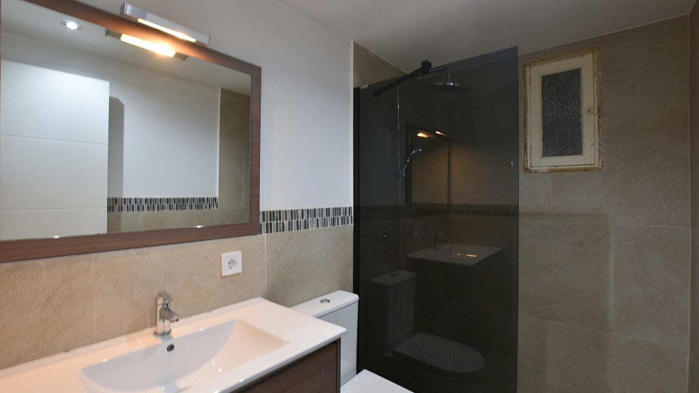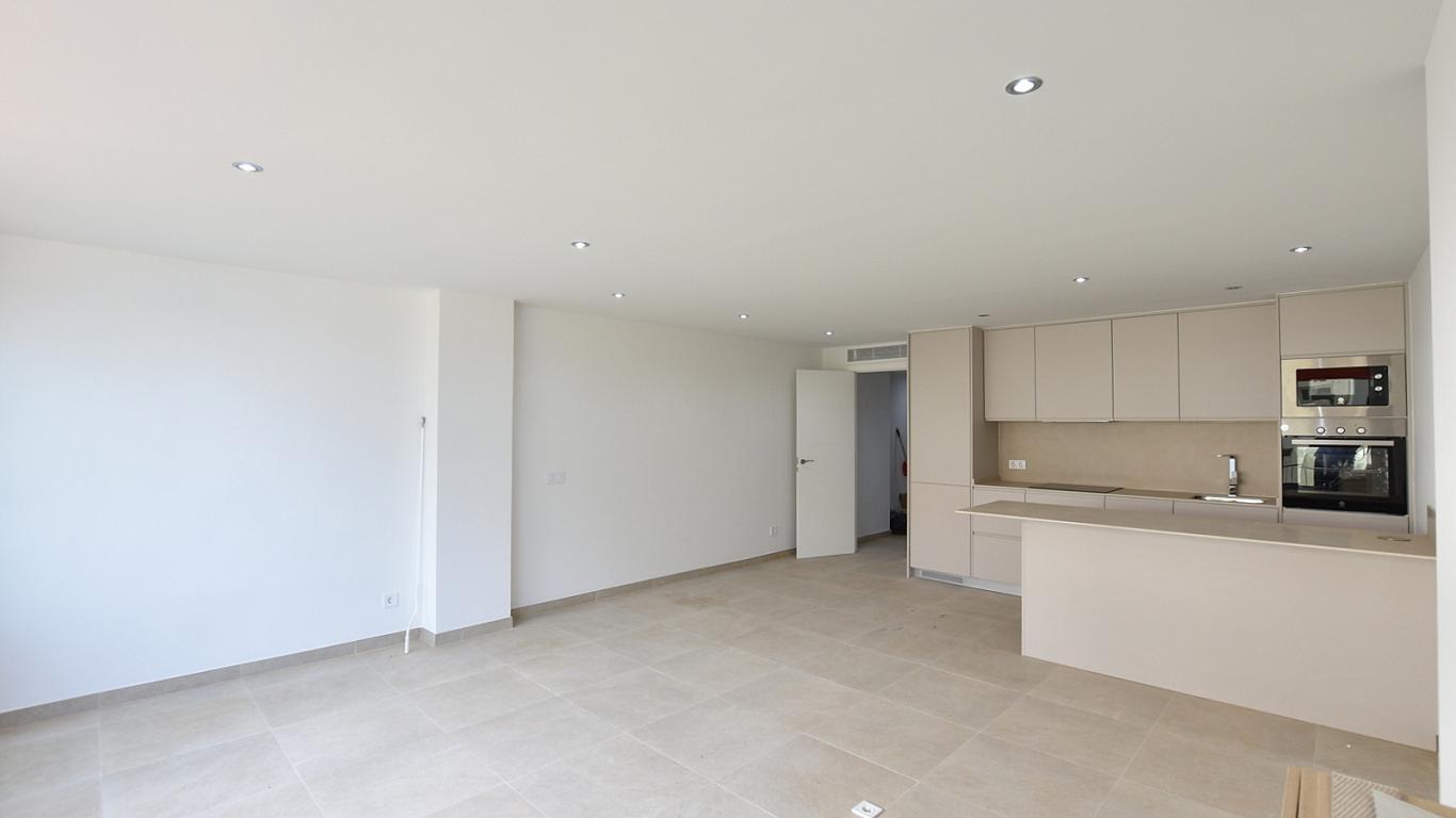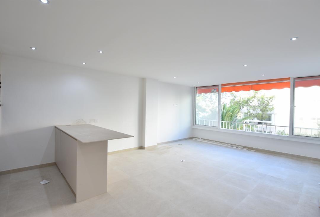 Großzügiger, moderner Wohnbereich mit offenem Grundriss, lichtdurchflutet und mit neuen Fenstern, die einen atemberaubenden Blick auf den Strand von Portals und das Meer bieten. Neu ausgestattete, hochwertige und moderne Küche mit allen neuen Geräten. Wohnfläche 60 m².