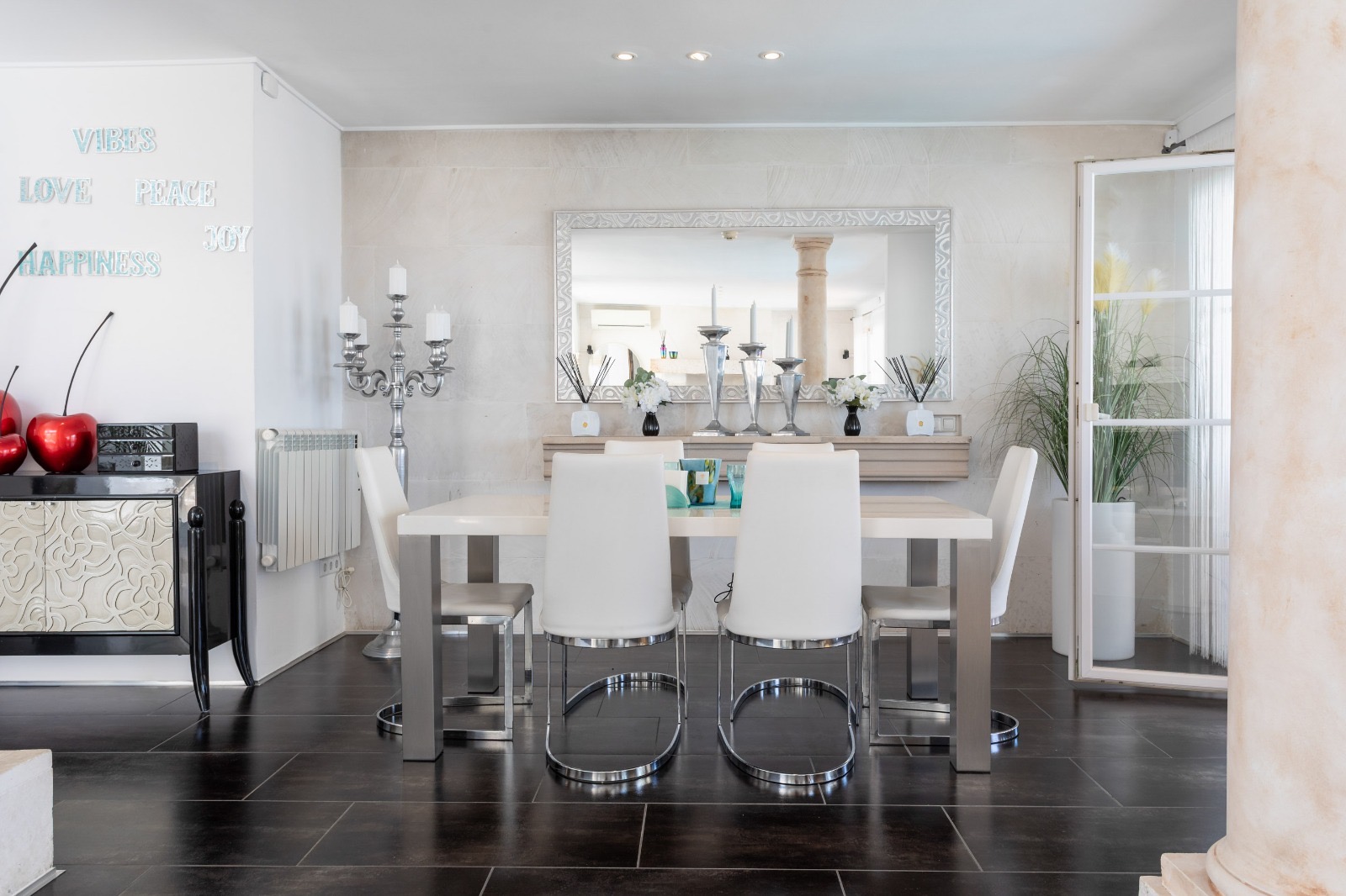 Das Äußere verbindet Design und Wärme, ein Wohnzimmer mit Kamin, das Charakter und eine gemütliche Atmosphäre verleiht. Ein Gäste-WC, ein Esszimmer, eine Küche, swie ein Raum mit Büronutzung. Als zentrales Element überrascht Sie das Erdgeschoss mit einem verglasten Raum mit mediterranem Innenhofdesign, diese Ecke vermittelt eine raffinierte und romantische Atmosphäre, die von mehreren Punkten aus sichtbar ist und Ihnen natürliches Licht und eine einzigartige Umgebung bietet.