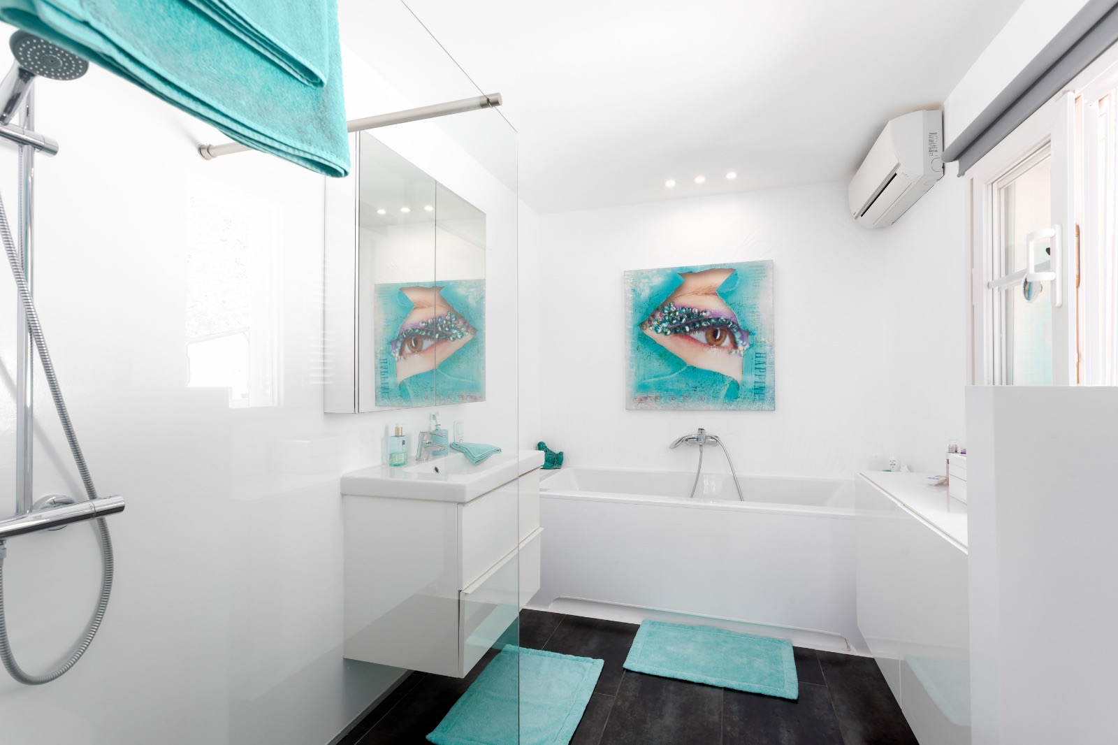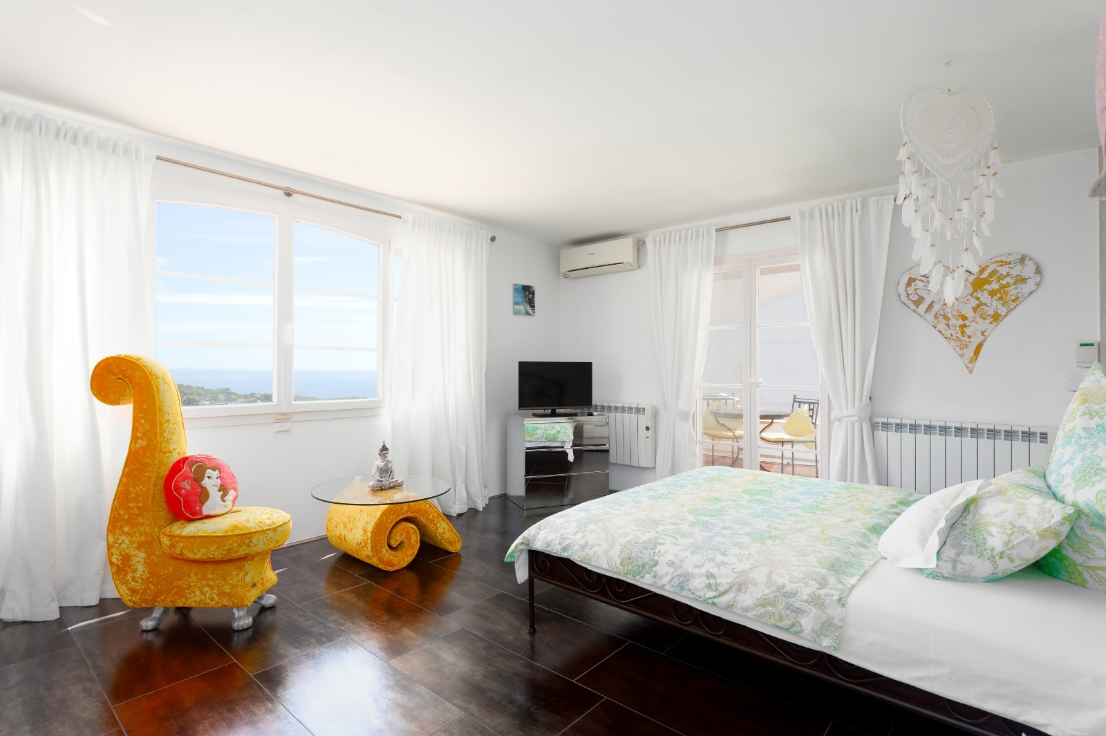 Im Obergeschoss befinden sich vier Schlafzimmer und zwei Badezimmer, eines davon en suite und mit einer gemütlichen Terrasse, ideal zum Frühstücken mit Blick auf den blauen Horizont.