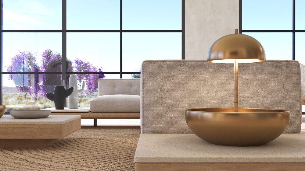 Ein offener Wohnraum mit offener Küche liegt vor der Terrasse zum Pool.